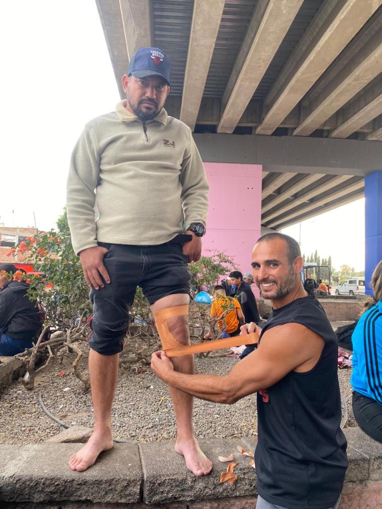 Strapping a man’s knee for support. Irapuato, Mexico. January 2024