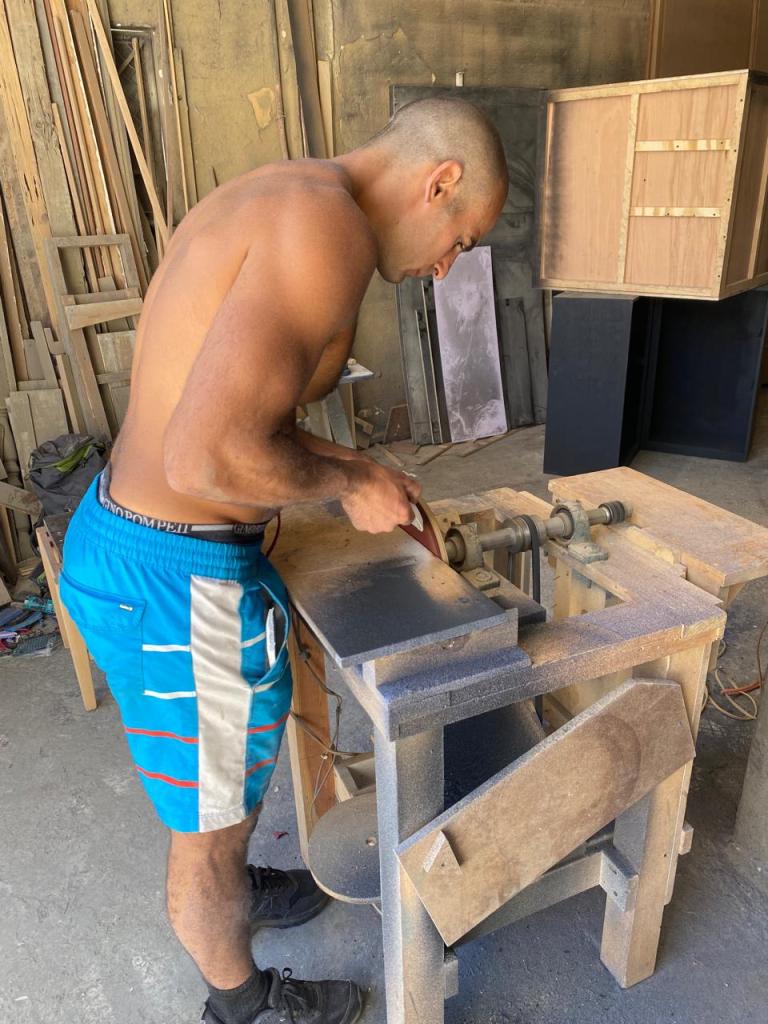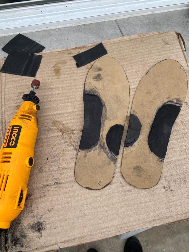 Creating arch supports from recycled sandals. Irapuato, Mexico. January 2024